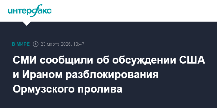 Москва. 23 марта. INTERFAX.RU - США и Иран ведут обсуждение возможного прекращения огня, первая фаза которого будет включать в себя отмену блокады Ормузского пролива и отказ Вашингтона от ударов по иранским электростанциям, передает Ynet со ссылкой на источники в Израиле.