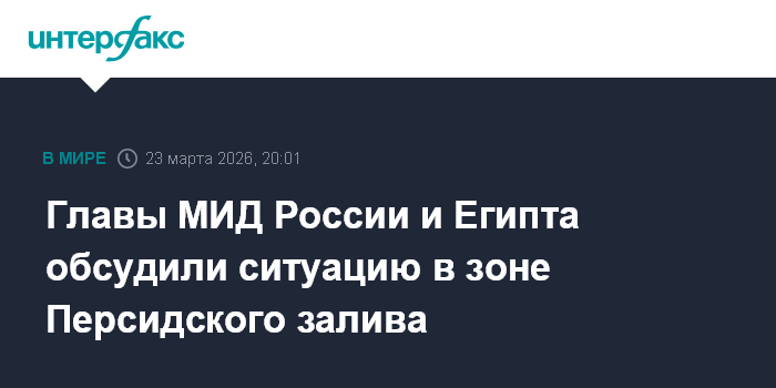 Москва. 23 марта. INTERFAX.RU - Главы МИД РФ и Египта Сергей Лавров и Бадр Абдельати провели в понедельник телефонный разговор и обсудили ситуацию в зоне Персидского залива, сообщили на Смоленской площади.