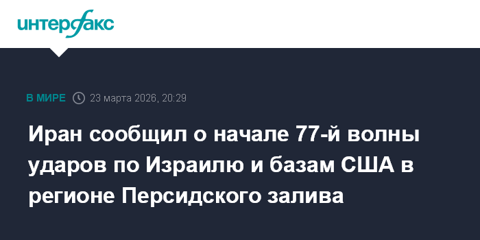 Москва. 23 марта. INTERFAX.RU - В Корпусе стражей Исламской революции (КСИР) сообщили о начале 77-волны ударов по Израилю и американским военным базам на Ближнем Востоке, передает в понедельник Al Jazeera.