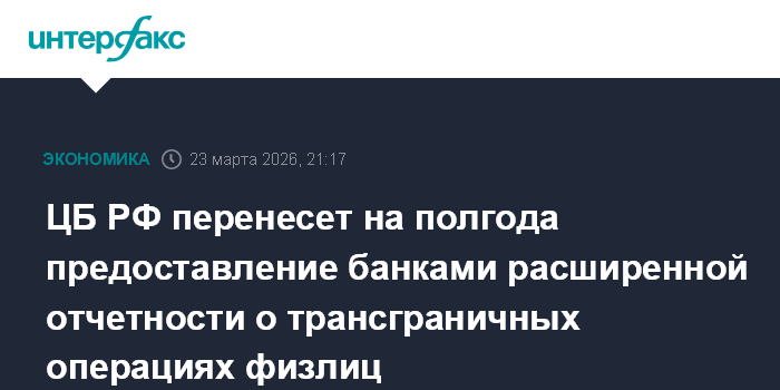 Москва. 23 марта. INTERFAX.RU - ЦБ РФ планирует отложить на полгода изменения в форму отчетности банков, расширяющие перечень сведений о трансграничных переводах физических лиц, следует из сводной таблицы предложений и замечаний к соответствующему проекту регулятора.