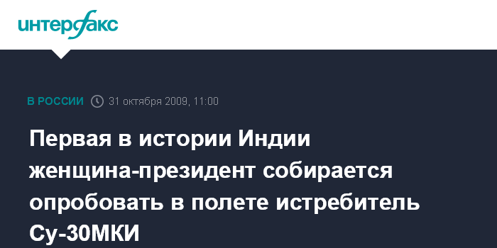Москва. 31 октября. INTERFAX.RU - 74-летняя президент Индии Пратибха Патил планирует совершить полет на двухместном истребителе Су-30МКИ, стоящем на вооружении индийских ВВС.