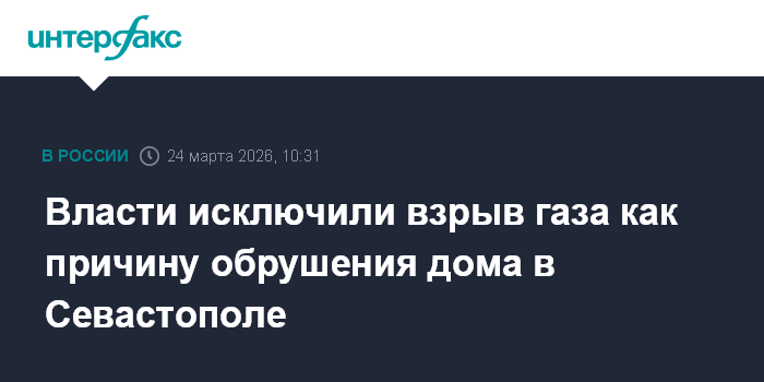 Москва. 24 марта. INTERFAX.RU - Взрыв бытового газа исключен в качестве причины обрушения многоэтажного жилого дома в Севастополе, точные обстоятельства происшествия устанавливаются, сообщил журналистам губернатор Севастополя Михаил Развожаев.