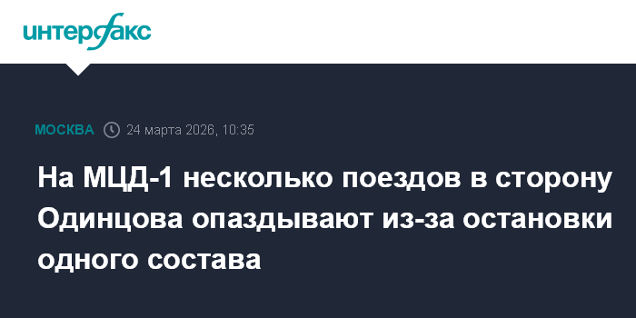 Москва. 24 марта. INTERFAX.RU - Несколько поездов первой линии Московских центральных диаметров (МЦД-1, D1) в сторону Одинцова задерживаются из-за остановки состава по техническим причинам на станции Лобня; принимаются меры для сокращения опозданий, сообщили "Интерфаксу" в Центральной пригородной пассажирской компании (ЦППК).