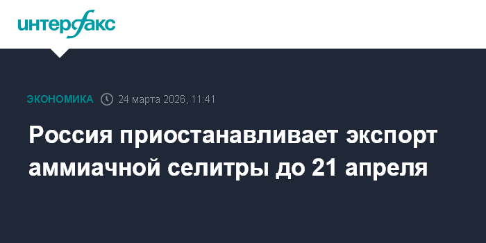 Москва. 24 марта. INTERFAX.RU - Россия ужесточила ограничения на вывоз аммиачной селитры на период с 21 марта по 21 апреля 2026 года, сообщил Минсельхоз.