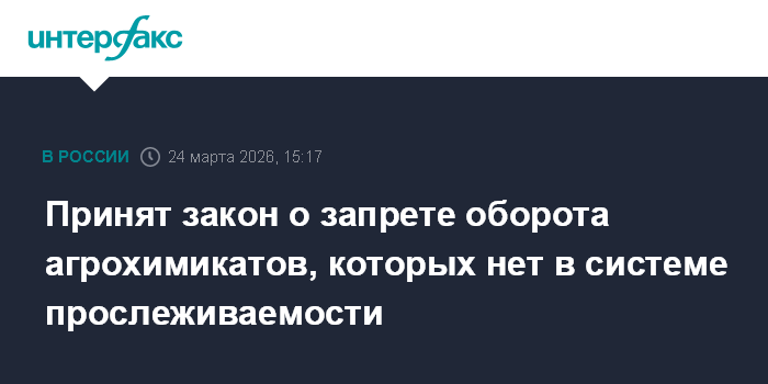 Москва. 24 марта. INTERFAX.RU - Госдума приняла в третьем чтении законопроект № 883107-8, который запрещает в России оборот пестицидов и агрохимикатов, сведения о которых отсутствуют в Федеральной государственной информационной системе прослеживаемости (ФГИС) или сведения о которых внесены в систему, но содержат недостоверную информацию.