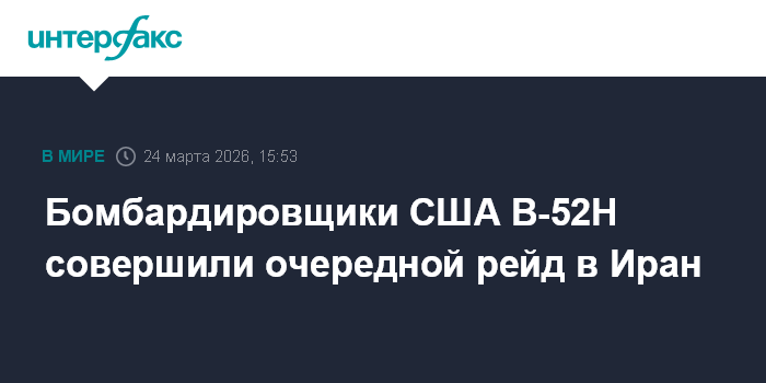 Москва. 24 марта. INTERFAX.RU - Два стратегических бомбардировщика ВВС США B-52H Stratofortress во вторник вернулись на авиабазу Фэрфорд в Великобритании после выполнения боевых задач в небе над Ираном, следует из данных авиационных ресурсов Military Air Tracking Alliance (MATA).