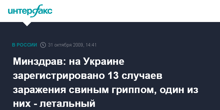 Москва. 31 октября. INTERFAX.RU - По состоянию на субботу, 31 октября, на Украине официально подтверждено 13 случаев заражения гриппом A/H1N1, в том числе один случай со смертельным исходом, сообщил министр здравоохранения страны Василий Князевич.