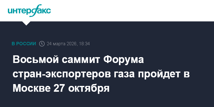 Москва. 24 марта. INTERFAX.RU - Утверждена дата проведения Восьмого саммита глав государств и правительств стран-участниц Форума стран-экспортеров газа. Мероприятие состоится в Москве 27 октября 2026 года, сообщает Росконгресс.