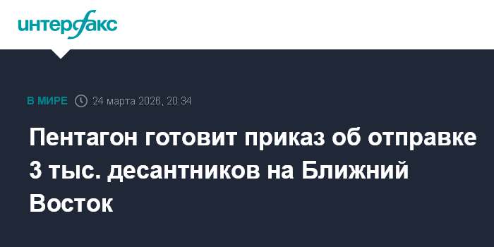 Москва. 24 марта. INTERFAX.RU - Пентагон готовит приказ об отправке бригады элитной 82-й воздушно-десантной дивизии армии США на Ближний Восток. Об этом сообщила газета The Wall Street Journal, ссылаясь на информированные источники.