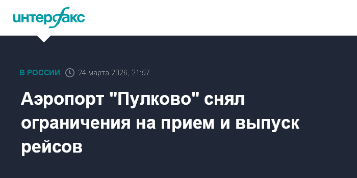 Москва. 24 марта. INTERFAX.RU - Временные ограничения на прием и выпуск воздушных судов, введенные ранее в петербургском аэропорту "Пулково", сняты, сообщает Росавиация.
