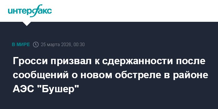 Москва. 25 марта. INTERFAX.RU - Глава МАГАТЭ Рафаэль Гросси призвал стороны иранского конфликта проявить сдержанность после поступления информации о новом обстреле в районе АЭС "Бушер".