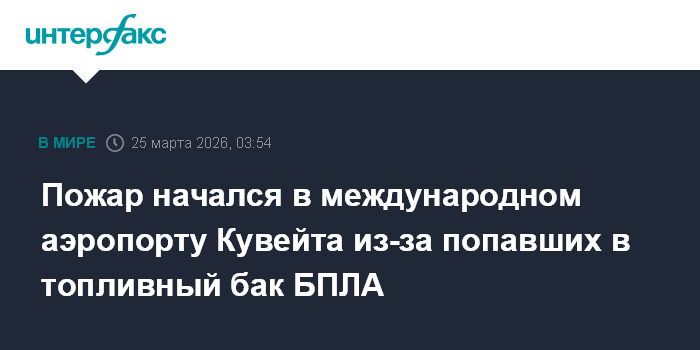 Москва. 25 марта. INTERFAX.RU - Беспилотники попали в топливный бак в международном аэропорту Кувейта, начался пожар, сообщило управление гражданской авиации страны.