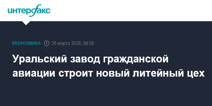 Москва. 25 марта. INTERFAX.RU - АО "Уральский завод гражданской авиации" (УЗГА, Екатеринбург) ведет строительство нового литейного цеха, сообщил губернатор Свердловской области Денис Паслер в своих соцсетях.
