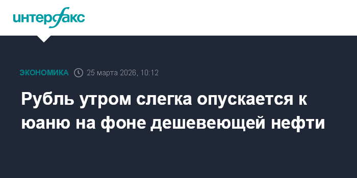 Москва. 25 марта. INTERFAX.RU - Китайский юань слабо растет на Московской бирже при открытии торгов в среду в рамках коррекции после сильного падения в начале недели. Рубль слабо опускается на фоне дешевеющей нефти, поддержку его котировкам оказывает спрос на рублевую ликвидность при подготовке экспортеров к налоговым выплатам марта.