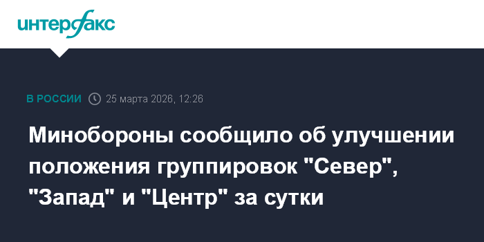 Москва. 25 марта. INTERFAX.RU - Группировки войск "Север", "Запад" и "Центр" в течение суток улучшили положение в зоне спецоперации, группировка "Восток" продвинулась в глубину украинской обороны, сообщили в Минобороны РФ в среду.