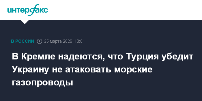 Москва. 25 марта. INTERFAX.RU - В Кремле надеются, что Турция окажет влияние на Украину в контексте попыток атаковать инфраструктуру газопроводов "Турецкий поток" и "Голубой поток" в Черном море.