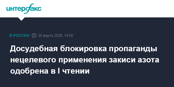 Москва. 25 марта. INTERFAX.RU - Госдума приняла в первом чтении законопроект № 1023994-8 о досудебной блокировке сайтов с информацией о нецелевом распространении закиси азота - то есть, не в целях производства пищевых продуктов и не для медицинского, промышленного или технического применения.