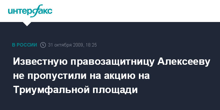 Москва. 31 октября. INTERFAX.RU - Председателя Московской Хельсинкской группы Людмилу Алексееву не пропустили на акцию в центре Москвы, на Триумфальной площади.