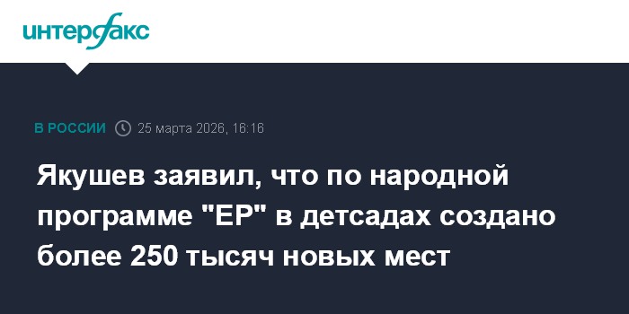 Москва. 25 марта. INTERFAX.RU - Народная программа "Единой России" позволила создать более 250 новых мест в детских садах, заявил секретарь Генсовета партии Владимир Якушев.