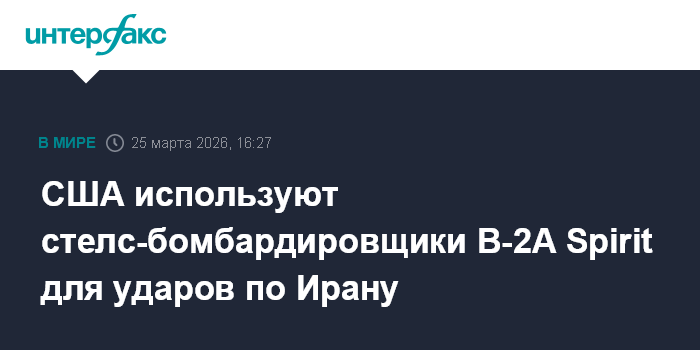 Москва. 25 марта. INTERFAX.RU - ВВС США используют стратегические стелс-бомбардировщики B-2A Spirit для нанесения бомбовых ударов по наиболее важным целям в Иране, сообщило издание The War Zone.