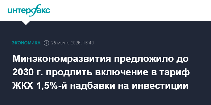 Москва. 25 марта. INTERFAX.RU - Применение инвестиционной надбавки в тарифах ЖКХ в виде 1,5% дополнительной выручки под реализацию инвестиционных программ может быть продлено до 2030 года. С таким предложением выступило Минэкономразвития РФ по итогам стратегической сессии правительства, состоявшейся в ноябре прошлого года и посвященной развитию строительной отрасли и жилищно-коммунального хозяйства (ЖКХ).