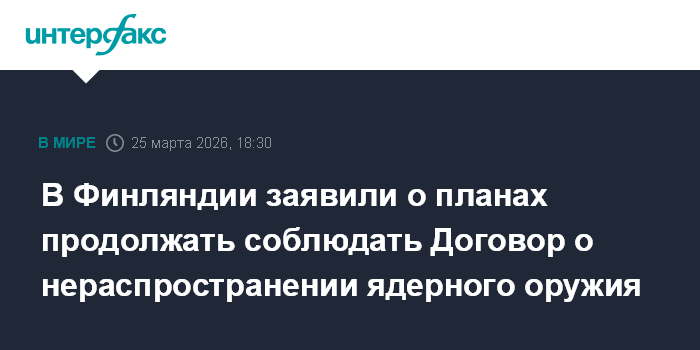 Москва. 25 марта. INTERFAX.RU - Хельсинки продолжит соблюдать Договор о нераспространении ядерного оружия, так как не стремится размещать его на своей территории, заявил в среду премьер-министр страны Петтери Орпо.