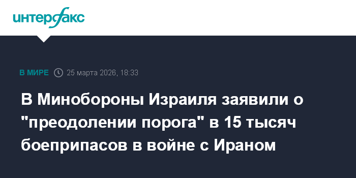 Москва. 25 марта. INTERFAX.RU - Израильские военные сбросили на Иран более 15 тысяч бомб с начала американо-израильской военной операции, заявил министр обороны Израиля Исраэль Кац.