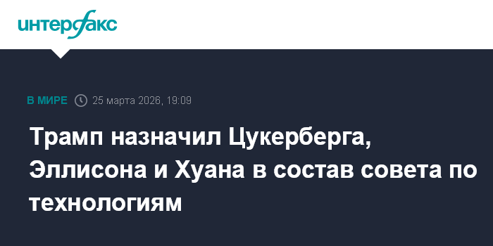 Москва. 25 марта. INTERFAX.RU - Президент США Дональд Трамп назначил в технологический совет ряд крупнейших представителей бизнеса, включая главных исполнительных директоров Meta (признана в России экстремистской и запрещена) и Nvidia Corp. Марка Цукерберга и Дженсена Хуана, а также сооснователя Oracle Corp. Ларри Эллисона для оценки политики в области ИИ и других вопросов.