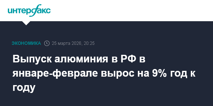 Москва. 25 марта. INTERFAX.RU - Производство первичного алюминия в РФ в январе-феврале 2026 года было на 8,9% выше показателя за аналогичный период прошлого года, сообщил Росстат.