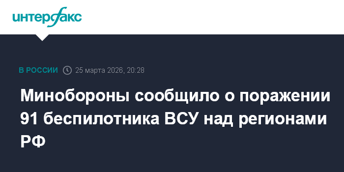 Москва. 25 марта. INTERFAX.RU - Российские военные сообщили, что с 13:00 до 20:00 дежурными средствами ПВО перехвачен и уничтожен 91 украинский беспилотный летательный аппарат самолетного типа.