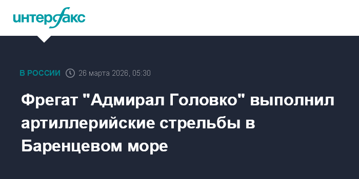 Москва. 26 марта. INTERFAX.RU - Фрегат Северного флота "Адмирал Головко" выполнил в Баренцевом море комплекс артиллерийских стрельб в рамках отработки действий одиночного корабля по предназначению в море, сообщила пресс-служба СФ.