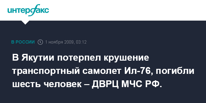 Хабаровск. 1 ноября. ИНТЕРФАКС-ДАЛЬНИЙ ВОСТОК - Транспортный самолет Ил-76 потерпел крушение в районе города Мирный (Якутия) в ночь на воскресенье, погибли шесть человек.