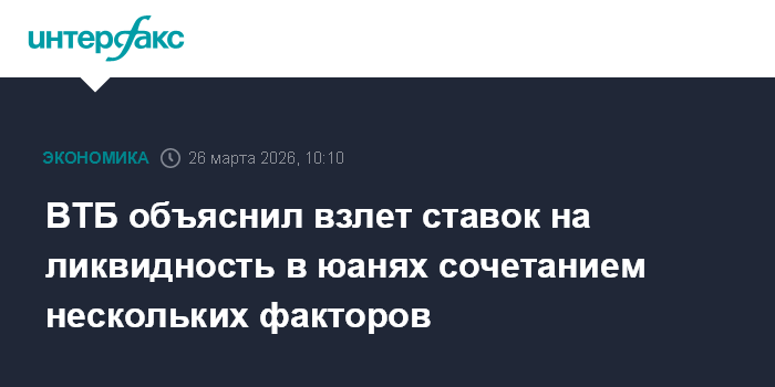 Москва. 26 марта. INTERFAX.RU - Резкий рост ставок на юаневую ликвидность обусловлен сочетанием нескольких факторов, ситуация постепенно выправляется, заявил первый зампред правления ВТБ Дмитрий Пьянов.