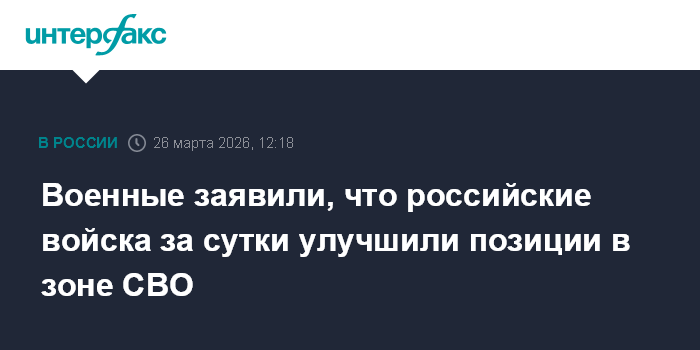 Москва. 26 марта. INTERFAX.RU - Группировки войск "Южная", "Центр" и "Запад" в течение суток улучшили позиции в зоне спецоперации, группировка "Восток" продолжила продвижение в глубину обороны вооруженных сил Украины, сообщили в Минобороны РФ в четверг.