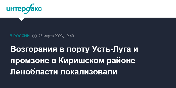 Москва. 26 марта. INTERFAX.RU - Возгорания в порту Усть-Луга и промзоне в Киришском районе локализованы, сообщает пресс-служба правительства Ленинградской области со ссылкой на региональную спасательную службу.