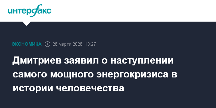 Москва. 26 марта. INTERFAX.RU - Наступает самый мощный энергетический кризис за всю историю человечества, по прогнозам Москвы, Европе понадобятся российские энергоносители, заявил спецпредставитель президента РФ по инвестиционно-экономическому сотрудничеству с зарубежными странами Кирилл Дмитриев.