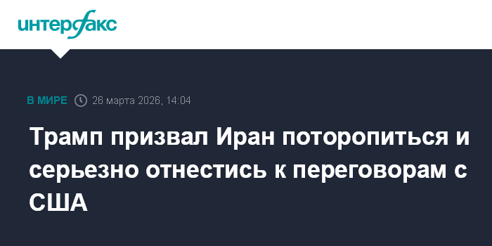 Москва. 26 марта. INTERFAX.RU - Президент США Дональд Трамп призвал Иран поторопиться и серьезно отнестись к переговорам по завершению конфликта с Соединенными Штатами, предупредив, что в противном случае Тегеран столкнется с серьезными последствиями.