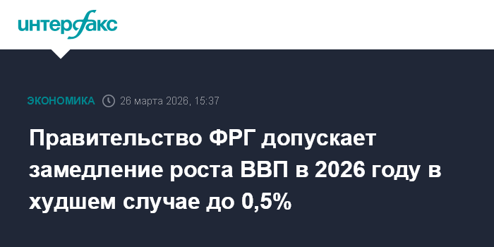 Москва. 26 марта. INTERFAX.RU - Правительство Германии опасается, что темпы роста экономики страны в 2026 году могут упасть вдвое, до 0,5% с ожидавшихся ранее 1%, в самом негативном сценарии развития ближневосточного кризиса, передает Bloomberg со ссылкой на информированные источники в правительстве ФРГ.