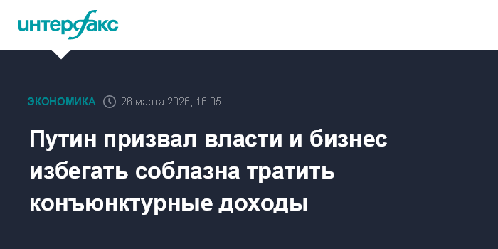 Москва. 26 марта. INTERFAX.RU - Государству и бизнесу необходимо избегать соблазна тратить конъюнктурные доходы, придерживаться умеренно консервативного подхода, в том числе в бюджетной системе, заявил президент РФ Владимир Путин.