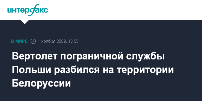 Минск. 1 ноября. INTERFAX.RU - Вертолет пограничной службы Польши потерпел крушение на территории Белоруссии, три члена экипажа погибли, сообщил агентству "Интерфакс-Запад" начальник пресс-службы Государственного пограничного комитета Белоруссии Александр Тищенко. "Вертолет польской погранслужбы патрулировал участок границы по взаимному уведомлению. В 20:11 31 октября от дежурного Бяла-Подляского отделения Польши поступило сообщение белорусским коллегам, что с вертолетом потеряна связь. Были организованы совместные поиски, и в 04:48 утра было установлено, что вертолет потерпел крушение в 200 метрах от линии государственной границы на территории Белоруссии. Ближайший населенный пункт - поселок Высокое Каменецкого района Брестской области (Беловежская пуща - ИФ)", - сказал А.Тищенко.