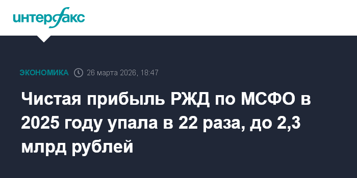Москва. 26 марта. INTERFAX.RU - Чистая прибыль ОАО "РЖД" по МСФО в 2025 г. упала в 22 раза и составила 2,3 млрд руб. против 50,7 млрд руб. годом ранее, сказано в отчете компании.
