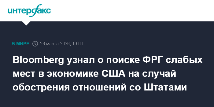 Москва. 26 марта. INTERFAX.RU - Власти Германии начали составлять список уязвимостей в экономике США, на которые можно надавить при новых серьёзных разногласиях с Вашингтоном, сообщает в четверг агентство Bloomberg со ссылкой на источники.
