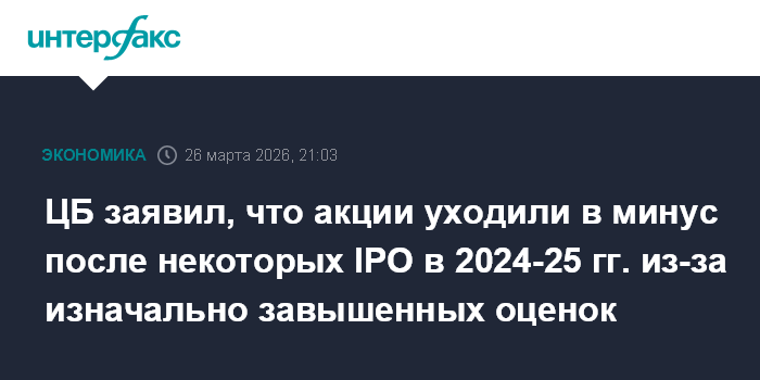 Москва. 26 марта. INTERFAX.RU - Падение капитализации некоторых российских эмитентов после первичных размещений в 2024-2025 годах объясняется не только общей динамикой фондового рынка: они изначально были переоценены при выходе на IPO, считает ЦБ РФ.