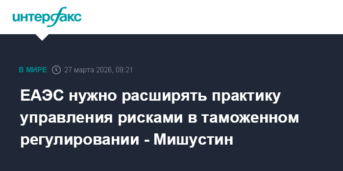 Москва. 27 марта. INTERFAX.RU - Евразийскому экономическому союзу (ЕАЭС) необходимо расширять практику управления рисками в таможенном регулировании, что снизит нагрузку на добросовестных предпринимателей, заявил премьер-министр РФ Михаил Мишустин, выступая на заседании Евразийского межправительственного совета в пятницу в Шымкенте (Казахстан).