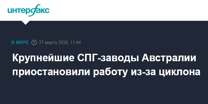 Москва. 27 марта. INTERFAX.RU - Мощный тропический циклон в Западной Австралии нарушил производство на крупнейших заводах страны по производству СПГ, принадлежащих Chevron Corp. и Woodside Energy.