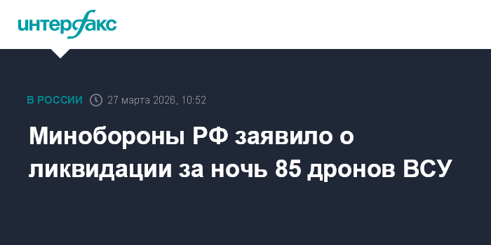 Москва. 27 марта. INTERFAX.RU - Российские военные с 23:00 мск четверга до 07:00 мск пятницы перехватили и уничтожили 85 украинских беспилотников, заявило Минобороны РФ.