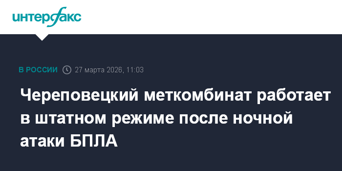 Москва. 27 марта. INTERFAX.RU - Череповецкий металлургический комбинат (ЧерМК) "Северстали" работает в штатном режиме после ночной атаки БПЛА, говорится на официальной странице "ВКонтакте" гендиректора дивизиона "Северсталь Российская сталь" и ресурсных активов Евгения Виноградова.