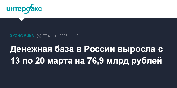 На 13 марта денежная база в России равнялась 19921,4 млрд рублей. Таким образом, за период она выросла на 0,38%, или на 76,9 млрд рублей.
