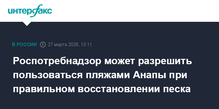 Москва. 27 марта. INTERFAX.RU - Роспотребнадзор готов разрешить использование пляжных территорий и прибрежных вод Анапы в рекреационных целях при условии строгого соблюдения всех правил проведения работ по восстановлению уровней песка, заявила глава ведомства Анна Попова. Ее слова привели в пресс-службе правительства.