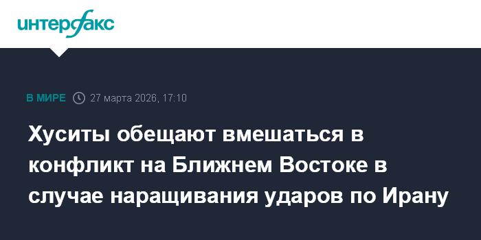 Москва. 27 марта. INTERFAX.RU - Хуситы также станут участниками нынешнего конфликта на Ближнем Востоке, если США и Израиль нарастят удары по Ирану, сообщает в пятницу CNN со ссылкой на заместителя министра информации движения Мухаммеда Мансура.